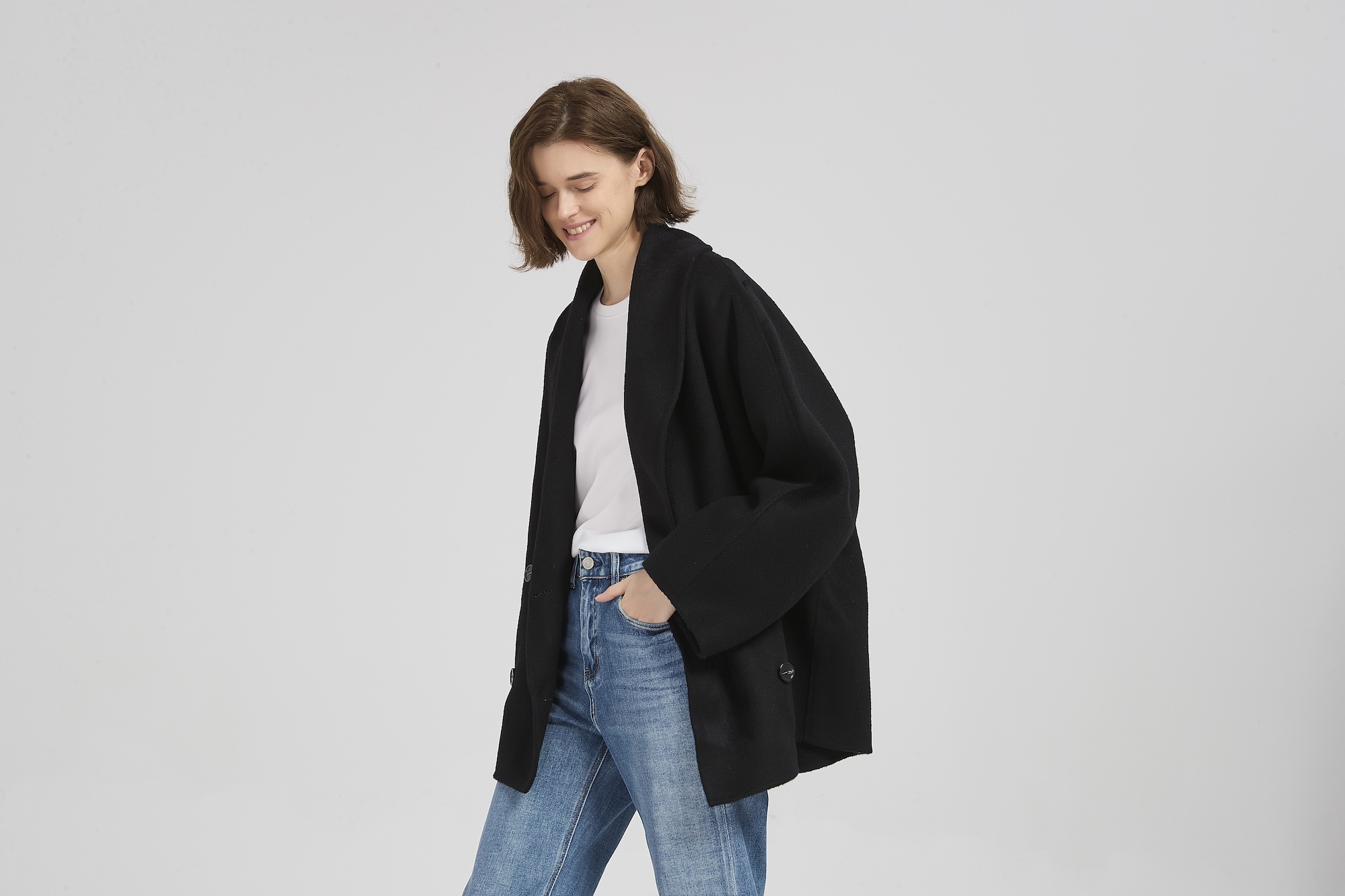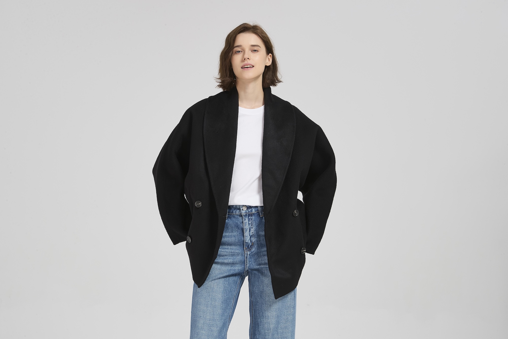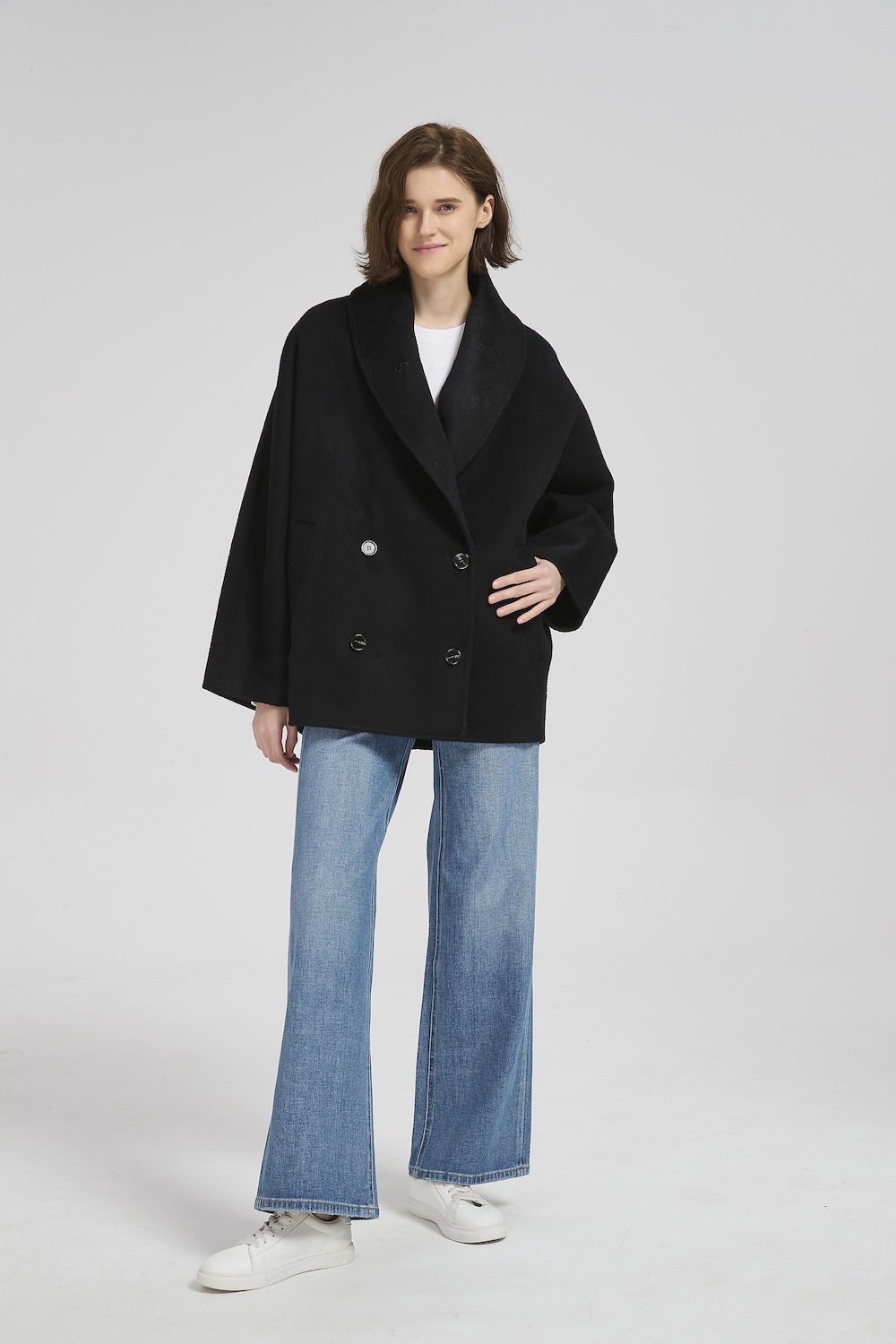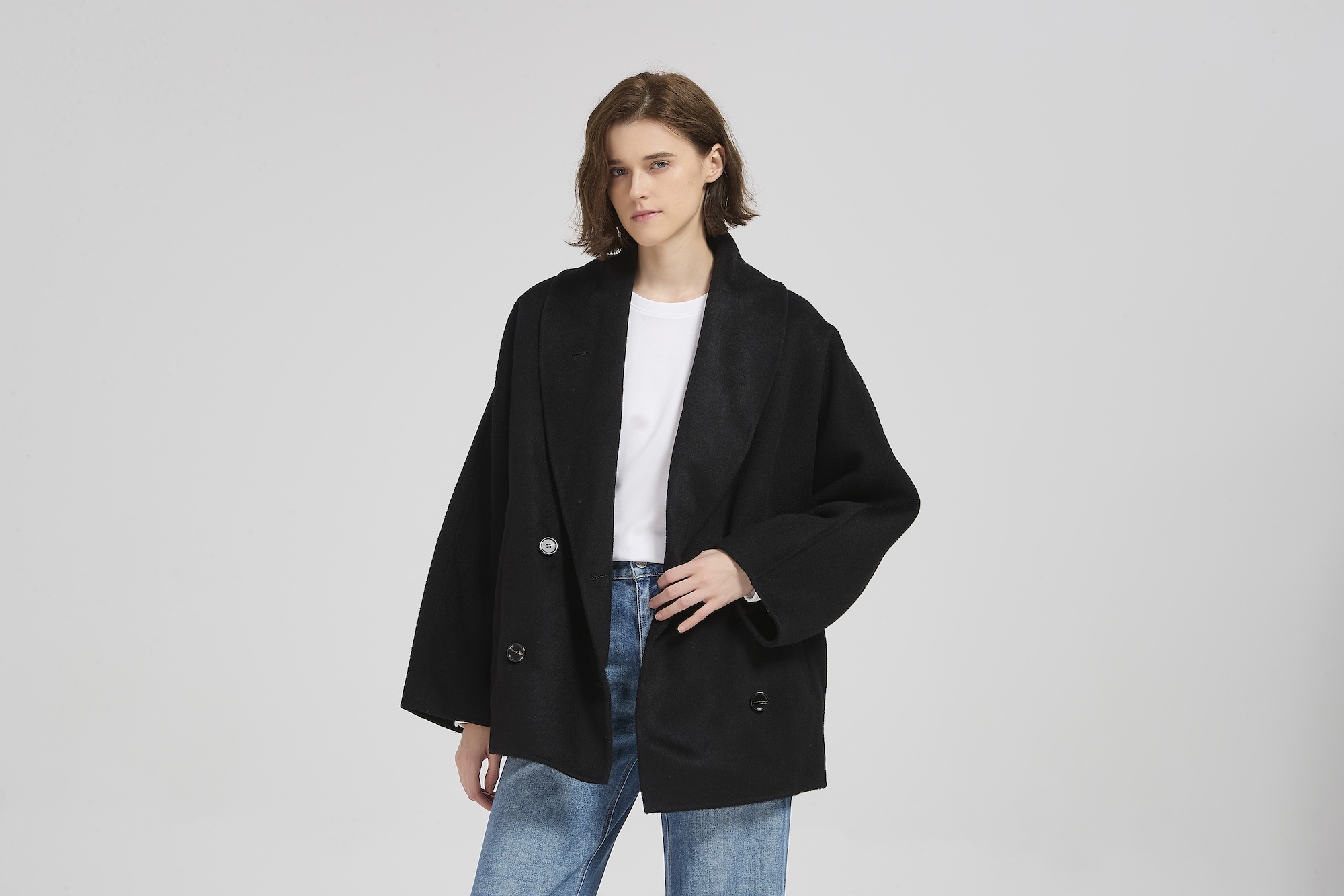 A relaxed double-breasted coat with a wide shawl collar and dropped shoulders. Where timeless tailoring meets modern ease.
