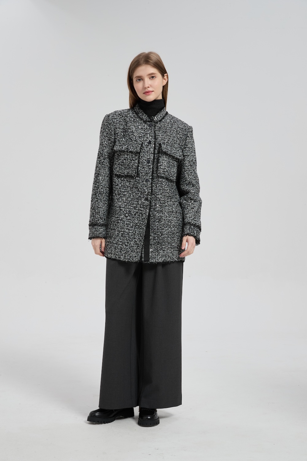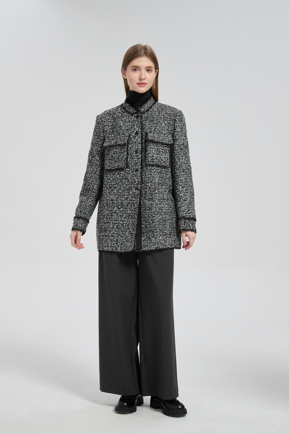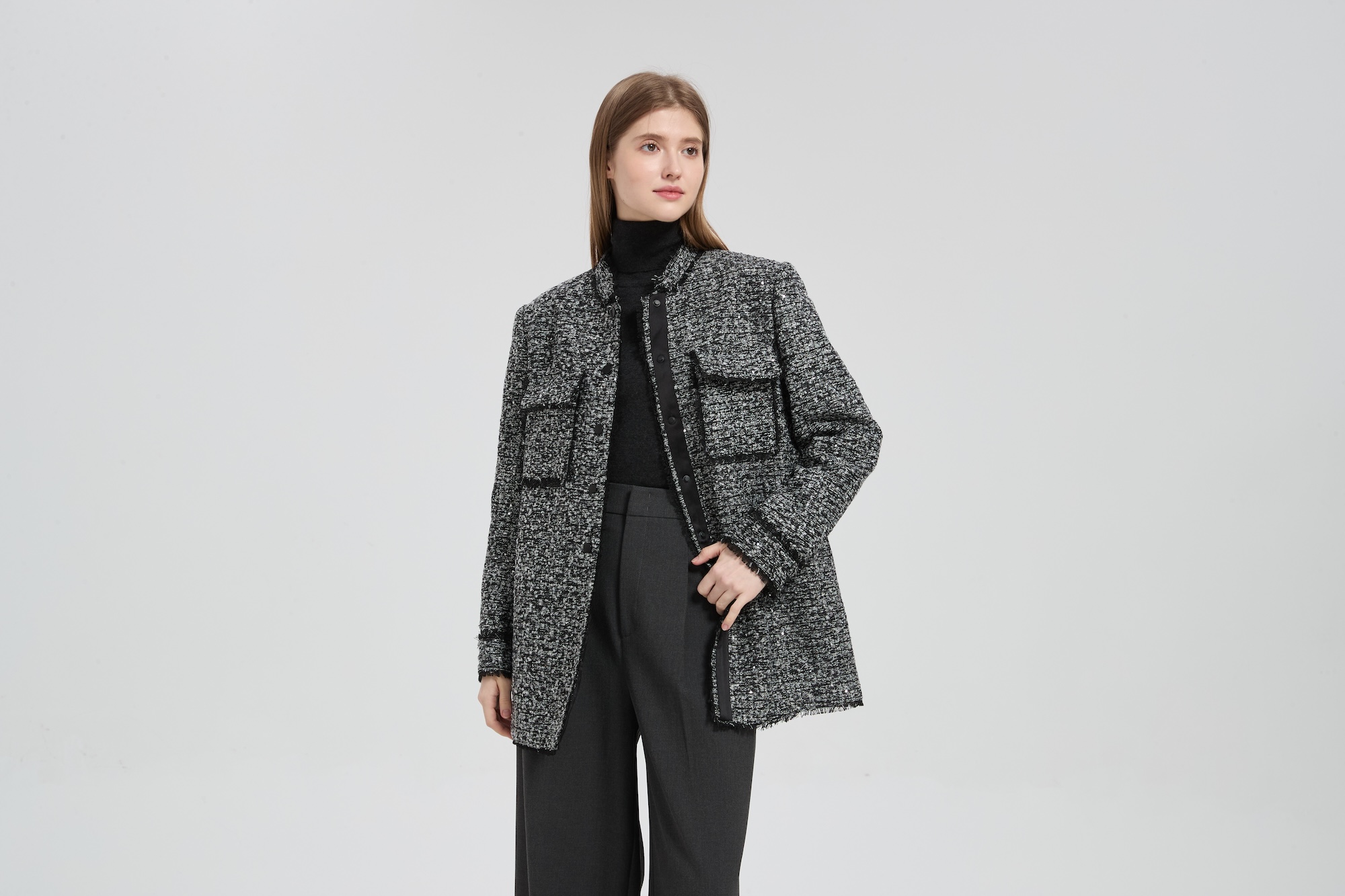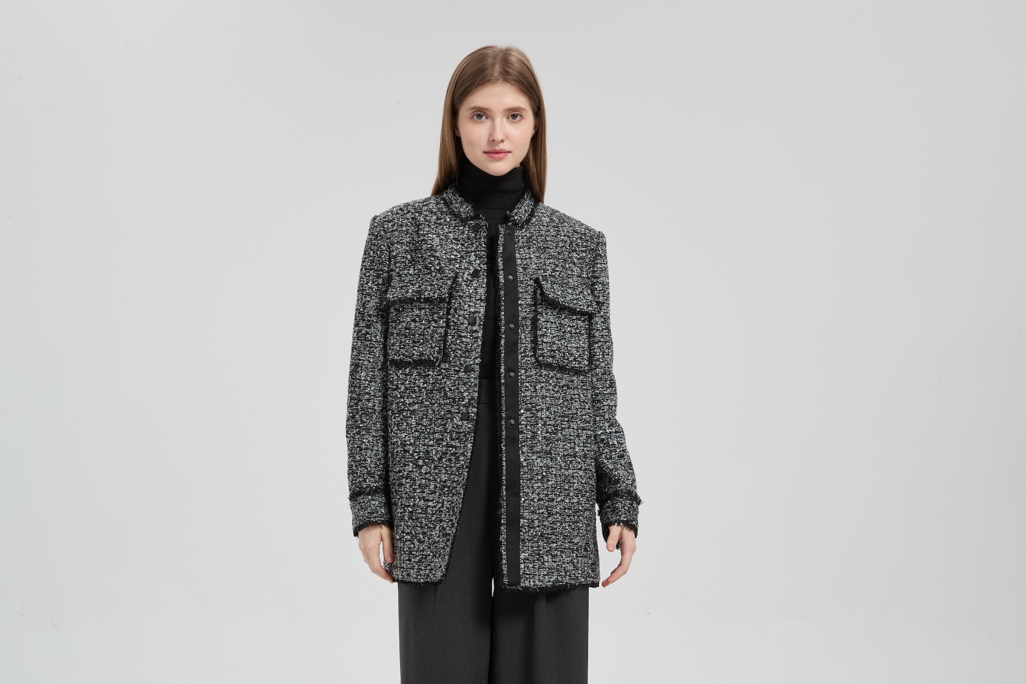 A chic black-and-white tweed jacket featuring a straight cut, front button closure, and two flap pockets. Finished with subtle frayed edges for a modern touch.