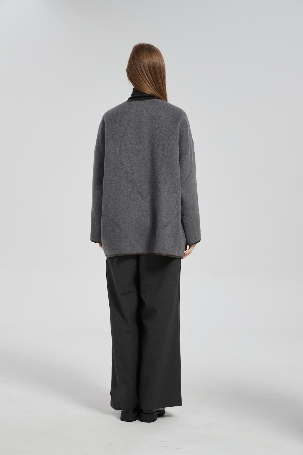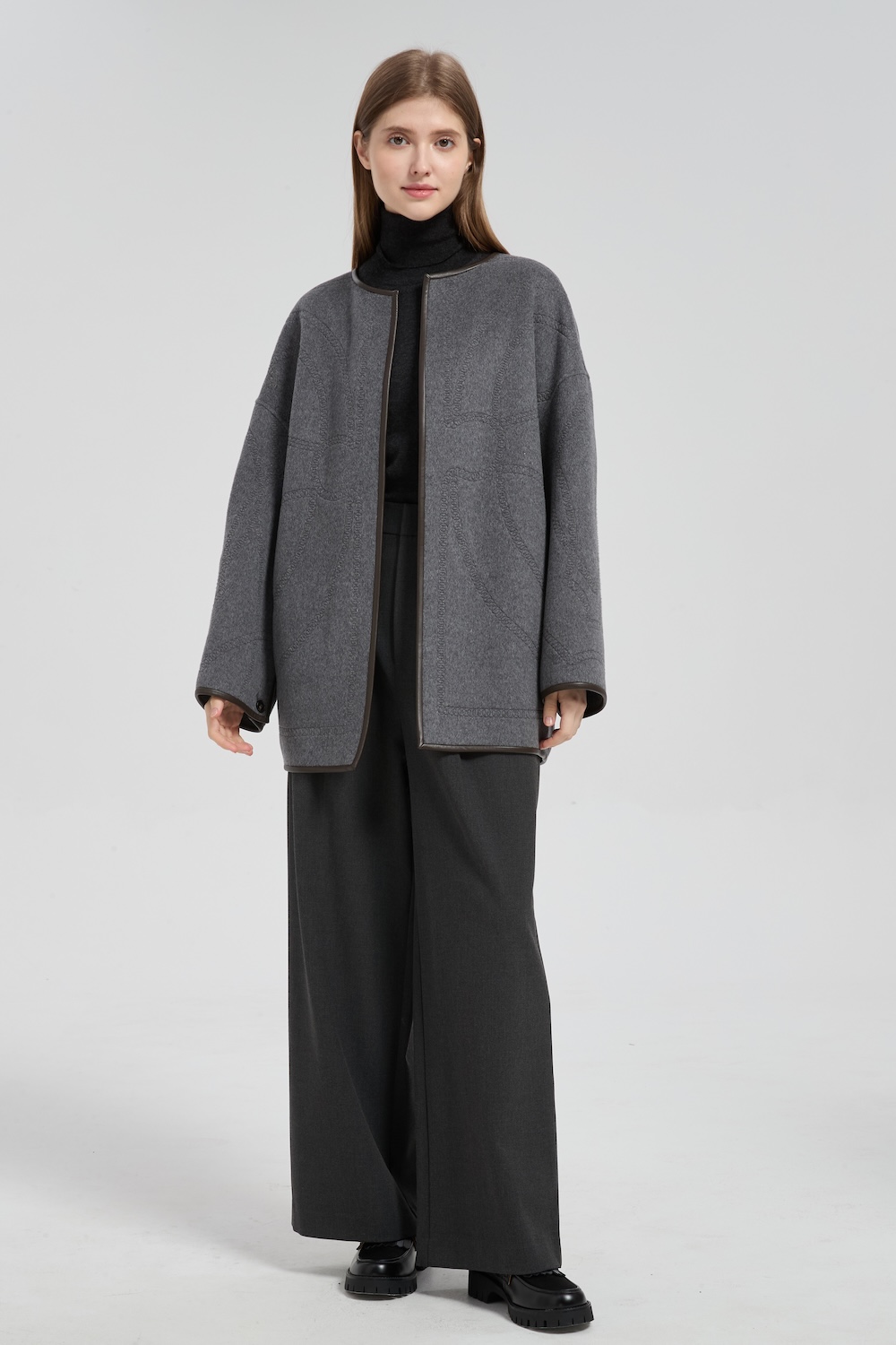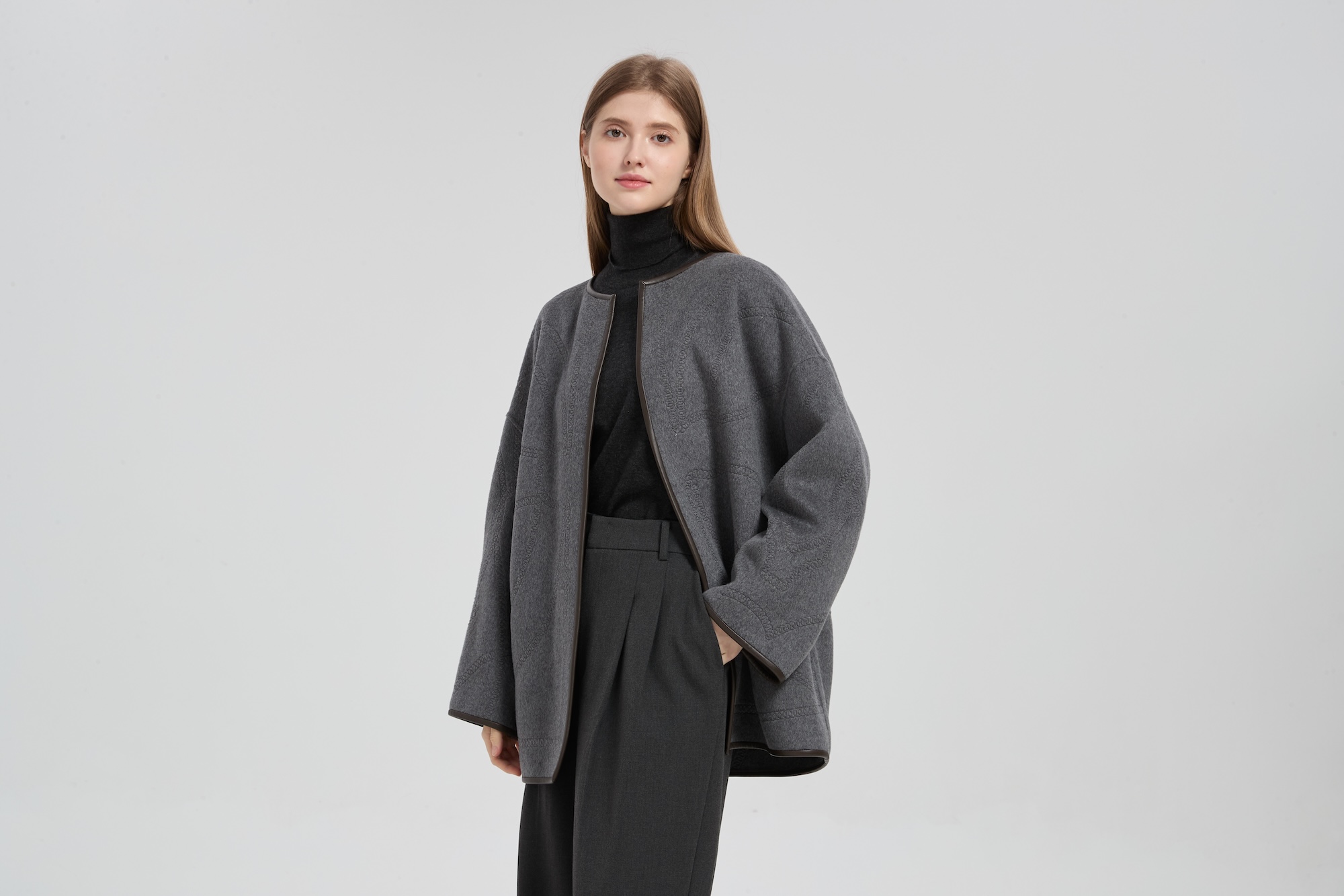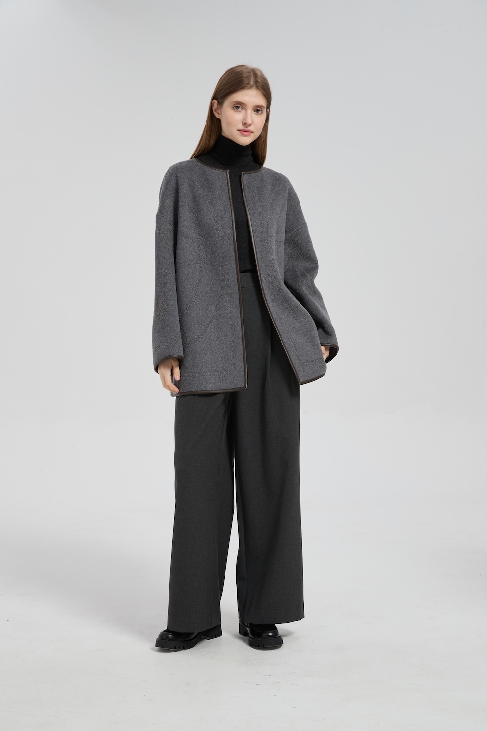 Minimalist grey wool jacket with a relaxed silhouette, open front design, and clean leather-trimmed edges for effortless sophistication.