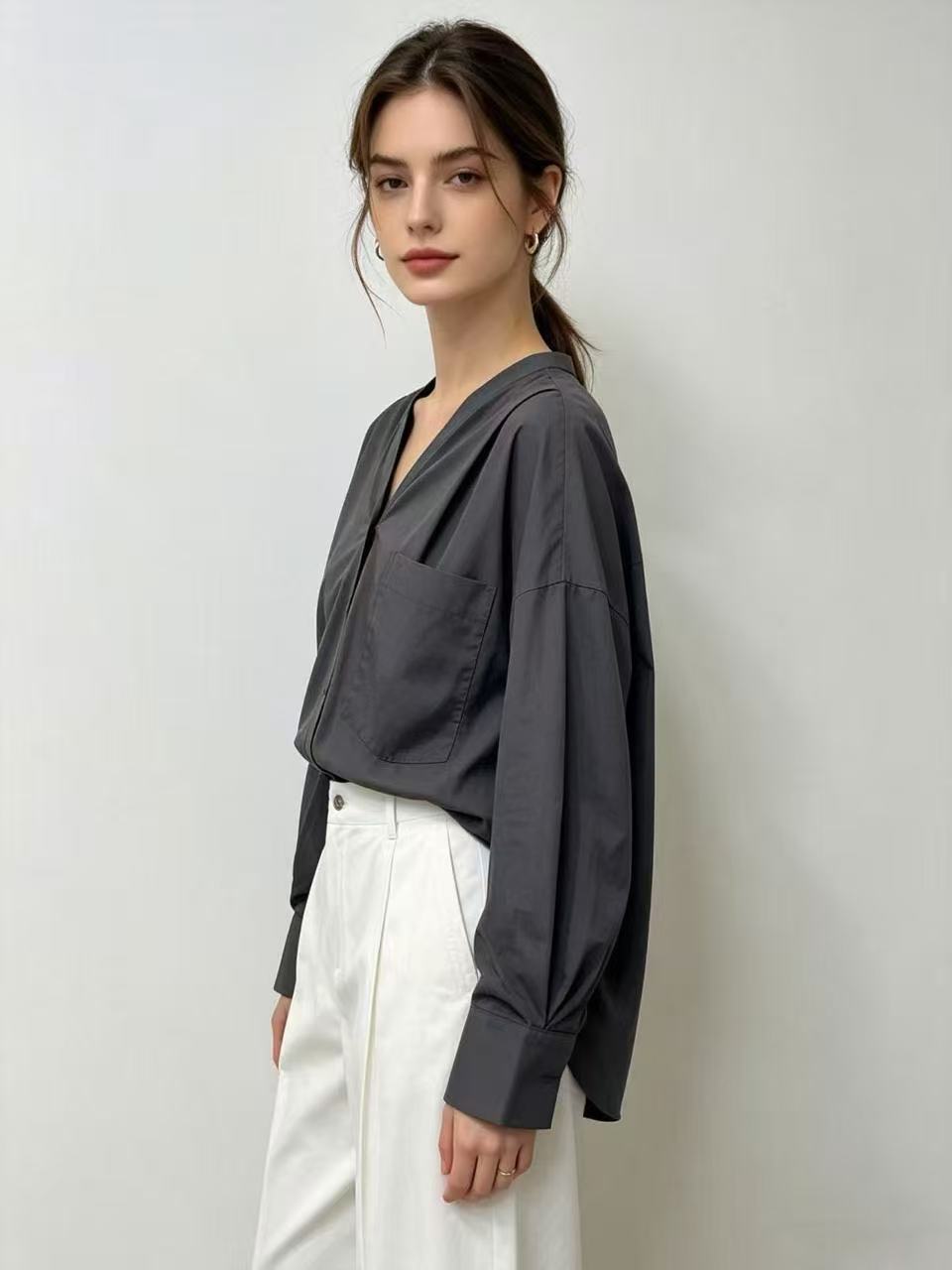 Relaxed V-neck blouse with a soft drape, button front, chest pocket, and long cuffed sleeves for an effortless minimalist look.